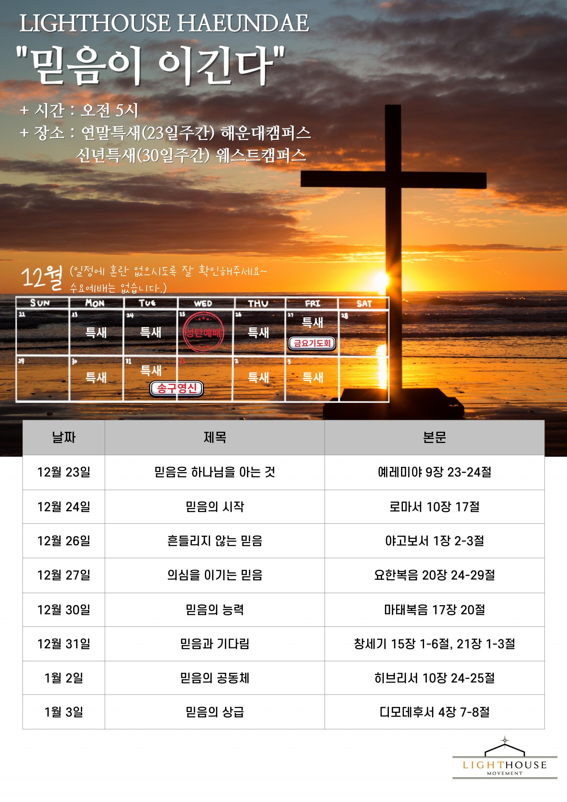 내일부터 "믿음이 이긴다"는 주제로 특별새벽기도회를 갖습니다.